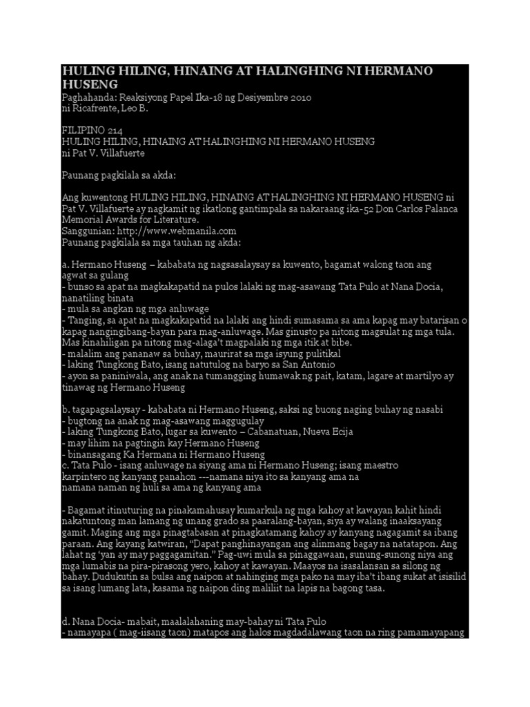 Katangian Hermano Kahalintulad Huseng na tauhan Katangian ka Santan Kahalintulad na tauhan Katangian Nana Kahalintulad Ducia na tauhan Katangian Tata Pulo Kahalintulad na. Kahalintulad na tauhan ni ka santan. Villafuerte Pangatlong Gantimpala sa Maikling Kuwento Carlos Palanca Memorial Awards for Literature 2002 Huling.