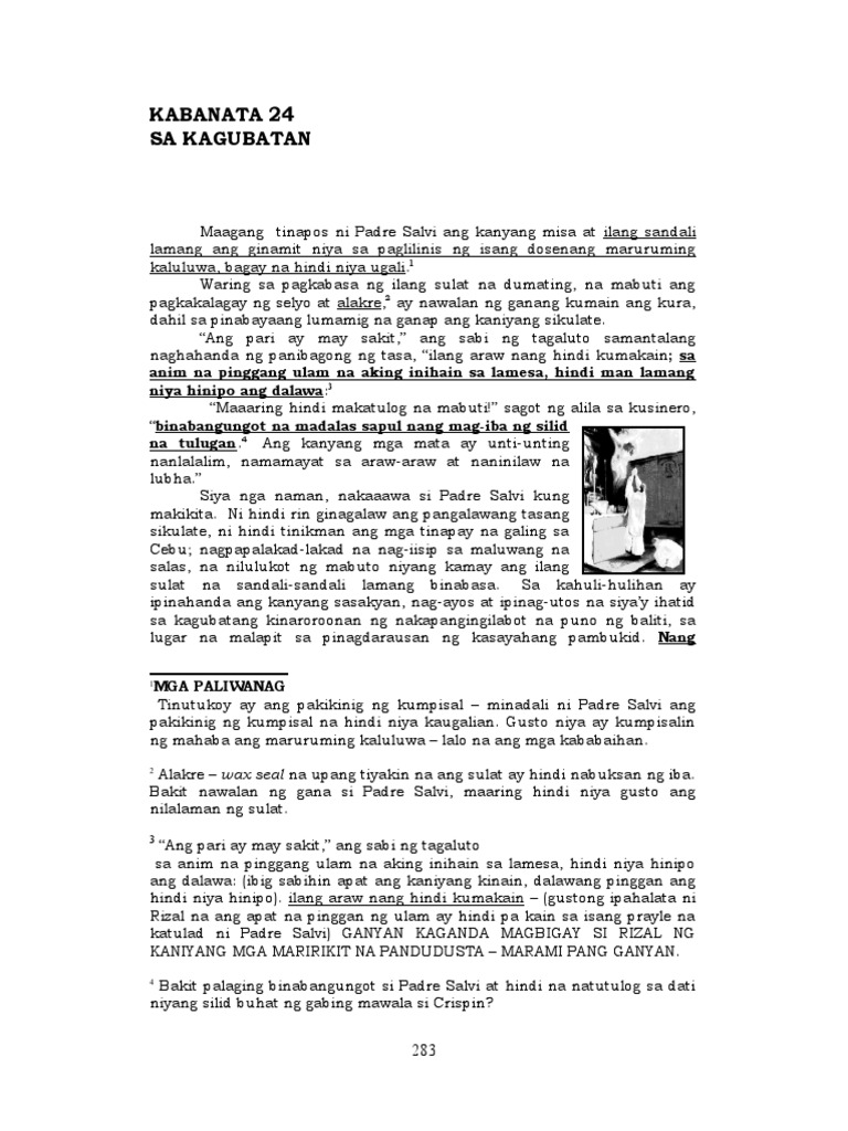 El Filibusterismo BuodPahiwatig ng Bawat Kabanata Historical Fiction. Sapat na sina Kabesang Tales ang mga naging kabinero at isang rehinameyento ng mga kawal. Sa pagdating naman niya sa kaniyang tinutuluyang bahay ay nadatnan ang kaniyang ina na nangangaral na maging mapagtimpi sa mga.