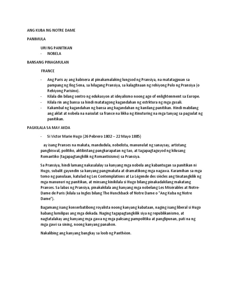 Ang kuba ng notre dame Ilarawan ang katangian ng mga tauhan sa nobela ng binasa at paano ipinakilala ang kultura o pagkakakilanlan ng bansa ng kaniyang pinagmulan. Katangian Ni Quasimodo Sa paksang ito ating tatalakayin kung ano nga ba ang mga katangian ni Quasimodo ang Kuba ng Notra Dame. Ang Kuba ng Notre Dame Nobela mula sa France The Hunchback of Notre Dame ni Victor Hugo Isinalin sa Filipino ni Willita A.
