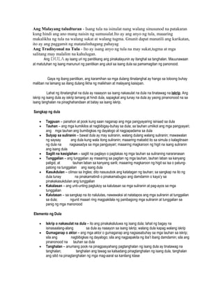 Parsa - ang layunin ng parsa ay magdulot ng katatawanan sa tagapanood. Panloob na Tunggalian Itoy uri ng tunggalian na nangyayari sa loob mismo ng tauhan. Sila ang pinanonood na tauhan sa dula Tanghalan Ito ang tawag sa kalsadang pinagtanghalan ng isang dula tanghalan ang silid na pinagtanghalan ng mga mag-aaral sa kanilang klase.