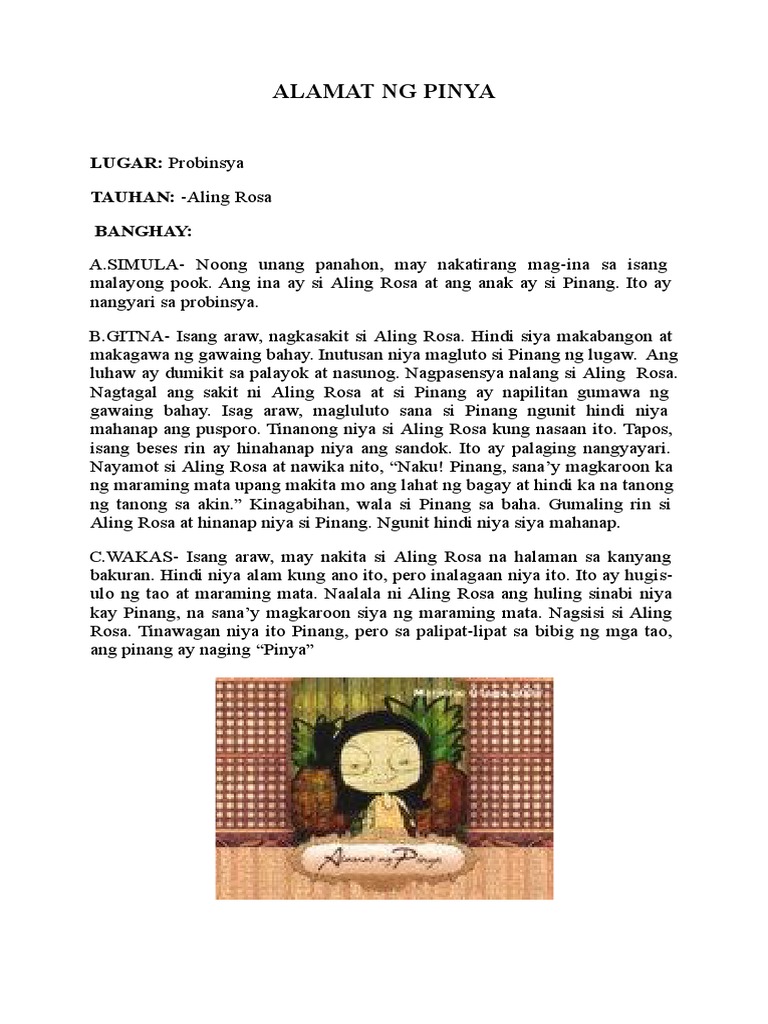 Mahal na mahal ni Aling Rosa ang kanyang bugtong na anak. Correct answer to the question Mga tauhan sa kwento ng alamat ng pinya. Una hindi ito maaasahan sa mga gawaing bahay.