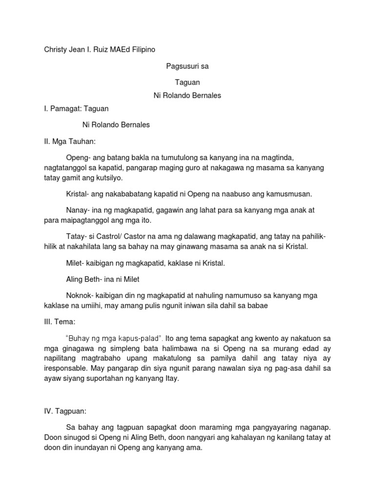 Evaluweyt Ang maikling kwento na taguan ay nagkaroon ng sapat na katibayan upang sumang-ayon ang mga mambabasa sa kaniyang paninindigan. PAGSUSURI SA MAIKLING KUWENTO Si Intoy Syokoy ng Kalye Marino Ni. Fil 7 Ang Sastre.